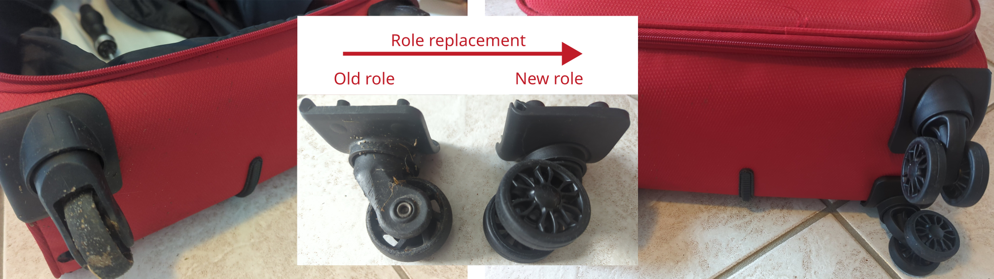 After replacing the wheels, the suitcase rolls quietly through the streets again.