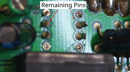 The remaining pins that are still stuck in the circuit board are removed with pliers while heating.